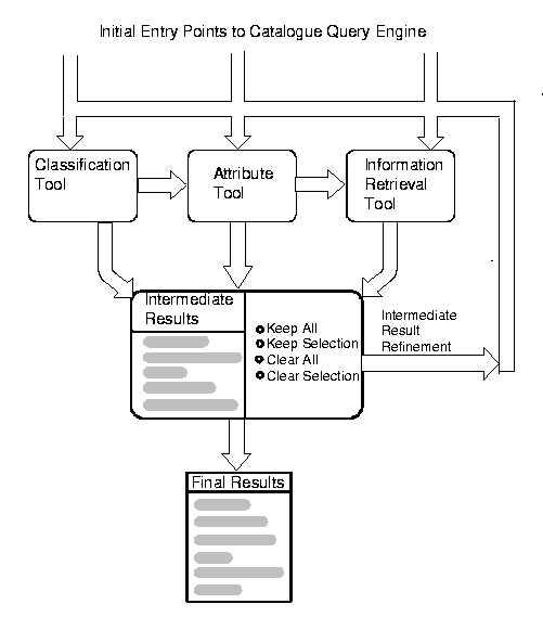 Once the initial query has been made, a list of suitable documents will appear in the intermediate results list box. From this list, the user may elect to keep all, or a selection, of the documents retrieved. Documents that are marked for keeping will appear in the final list of results, regardless of any subsequent queries. The user may now elect to refine the query, or add further results to the list. This is achieved by running any one of the query tools again, with a new query. The results of each iteration may be ANDed with the previous results, so that they are added to the previous results, expanding the set of results in the intermediate result box. Alternatively the new results may be ORed with the previous results, so that the new list of results satisfies all previous queries, thus successively refining the query, until a suitably small set of results has been collected.