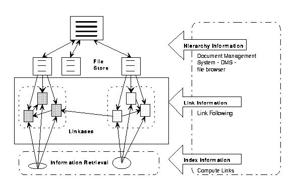 The methods Microcosm supports for locating information are represented in figure 2. The first method of access to the information uses the classification information. This is the information that that is held in the Document Management System (DMS) and is almost exactly equivalent to the information that is held in a library catalogue. It contains the position(s) within the document hierarchy that the file will be located, and it contains all the attributes, such as title, author, date of creation, physical media type and keywords. This information is very high quality, as it provides specific information about documents, and Microcosm provides tools for traversing the subject hierarchy, and for querying the documents by attributes such as keywords.