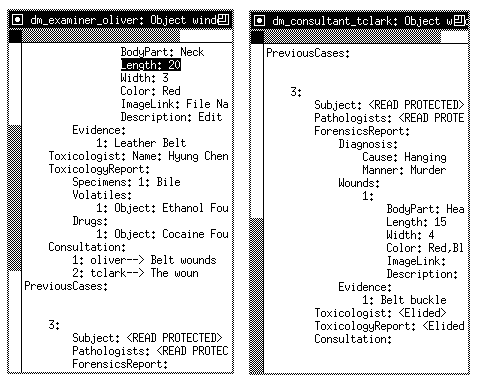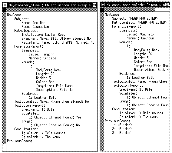 Each case is assigned to an examiner, who is responsible for its final contents. The NewCase object in the windows of Figure 2 contains an outline of the general structure of such a report. The report identifies the subject, examiner, assistant, and toxicologist on the case, describes the wounds and evidence found, and contains the results of the toxicology tests.