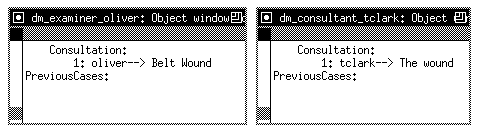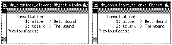 In addition to the values of the objects in the workspace, the application can also couple the views of these objects. A view of an object selects the set of fields of the object that are displayed to the user. For instance, the view of the object, PreviousCases, determines which of the previous cases are shown to the user. The digital library currently provides users with several commands to change the view of this object. For instance, it allows them to select all previous cases, none of the previous cases, all cases that involve wounds to a particular part of the body, and all cases in which the wound length is greater than, equal to, or less than a specific length. The application allows consultants working on the case to browse through previous case information separately (Figure 2) or together (Figure 3).