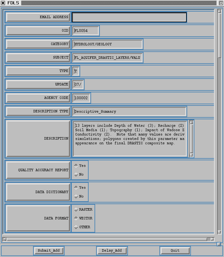Referring to Figure 3, the metadata template serves as a "blueprint" for describing the elements of spatial documents the user wants to register with the library. The first 4 lines define the "action buttons". Each button is associated with a shell script or program that is executed when that button is pressed. The remaining entries in the template define the fields that will comprise a metadata record of this type. Three types of fields exist in the template shown in the figure - radio button (R), numeric (N) and character (C). The numbers following the field type indicate, respectively, number of entries in a menu or number of lines of data in the field, and for data entry fields, width of each line, and number of instances of this field in the record (repeating field).