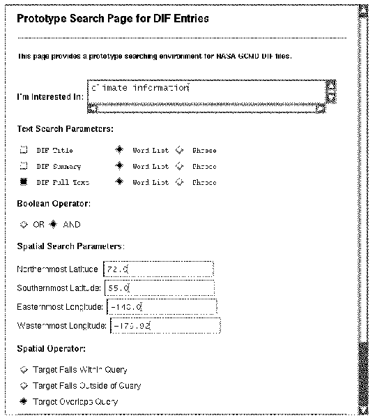 In this example, a user is searching for all data sets using climate as a topical search term within the full document (DIF Full Text) and a bounding rectangle set of search coordinates, as entered under the Spatial Search Parameters. Only those documents whose footprint overlaps the query region will be returned. The first 15 documents selected will be provided to the user in the form of `headlines' or document titles.